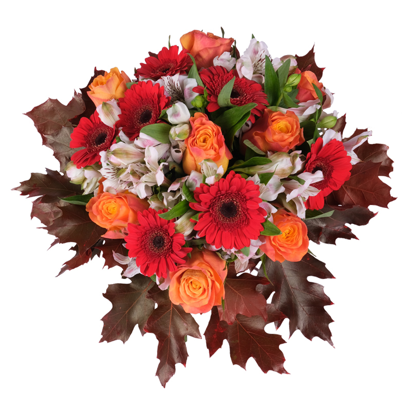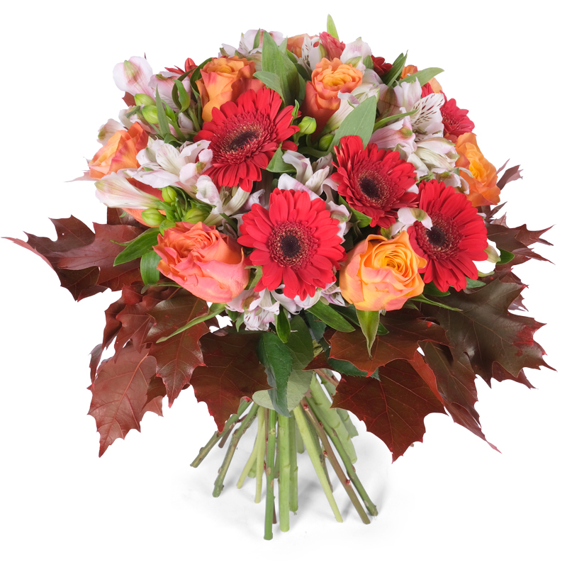 Bukiet oddający ducha najpełniejszej pory roku. Róże emanują ciepłem jesiennych dni, gerbery dodają radości, alstromerie subtelnie dopełniają. Ciemne liście nadają autentyczność całej aranżacji i sprawiają, że bukiet jest perfekcyjny dla każdego fana jesieni!