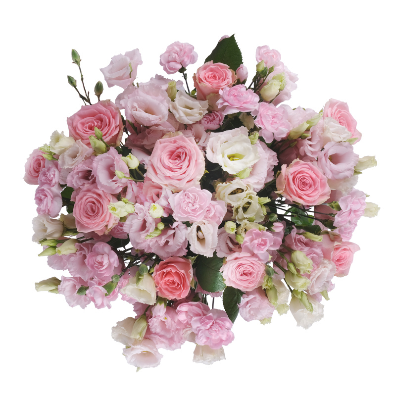 Różowy sen zamknięty w bukiecie – "Połączenie idealne" złożone z róż, eustom i goździków. Idealny z dodatkiem bileciku z życzeniami.